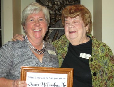 Jo Gallagher (right) presents Donna Brenneman, Executive Director - Hospice of Garrett County, with GFWC Civic Club of Oakland 2014 donation. June 20, 2014